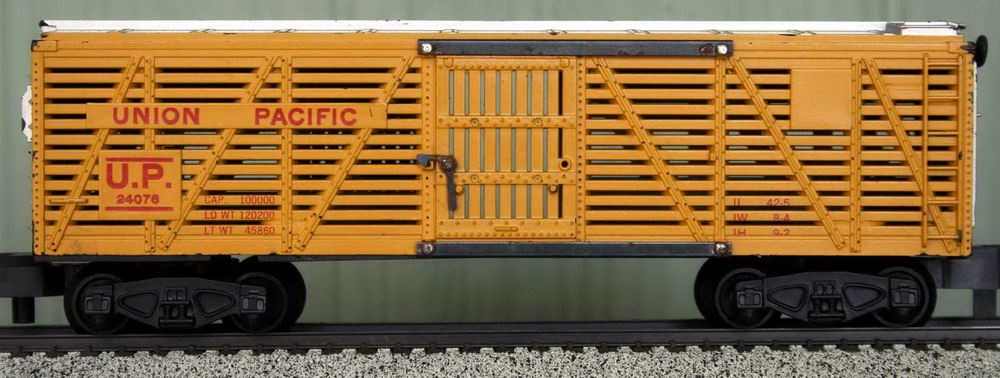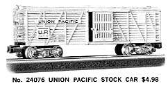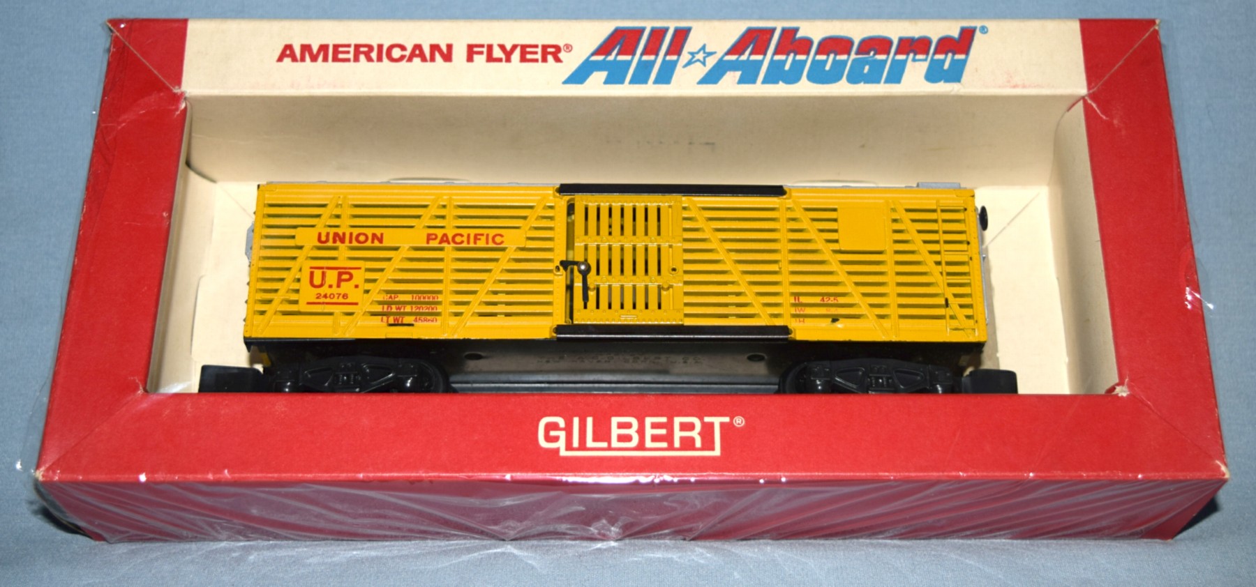 The reason for so few #24076 UP stock cars in an "All Aboard" box is that they were never produced much after 1961. Around 1965-66 Gilbert may have discovered they still had several #24076 in inventory and elected to package them in "All Aboard" packages to eliminate the inventory.