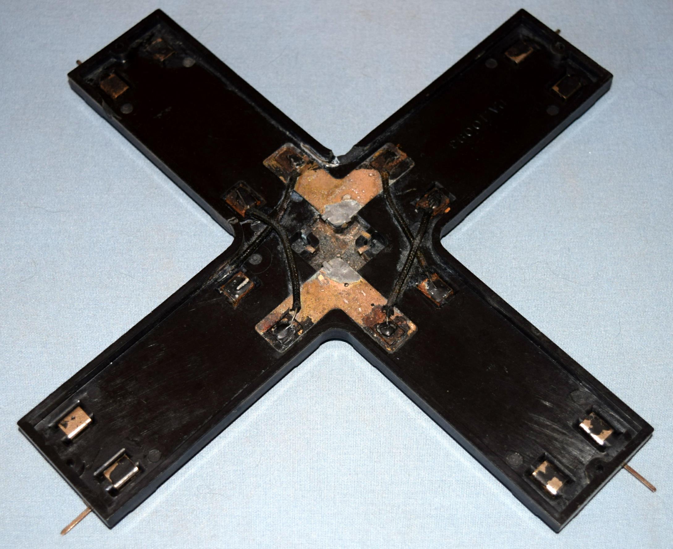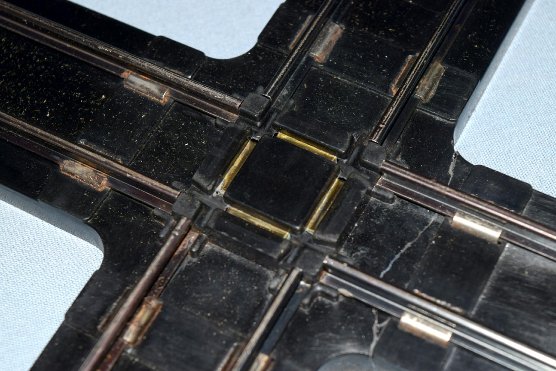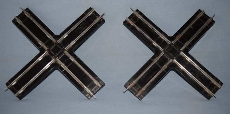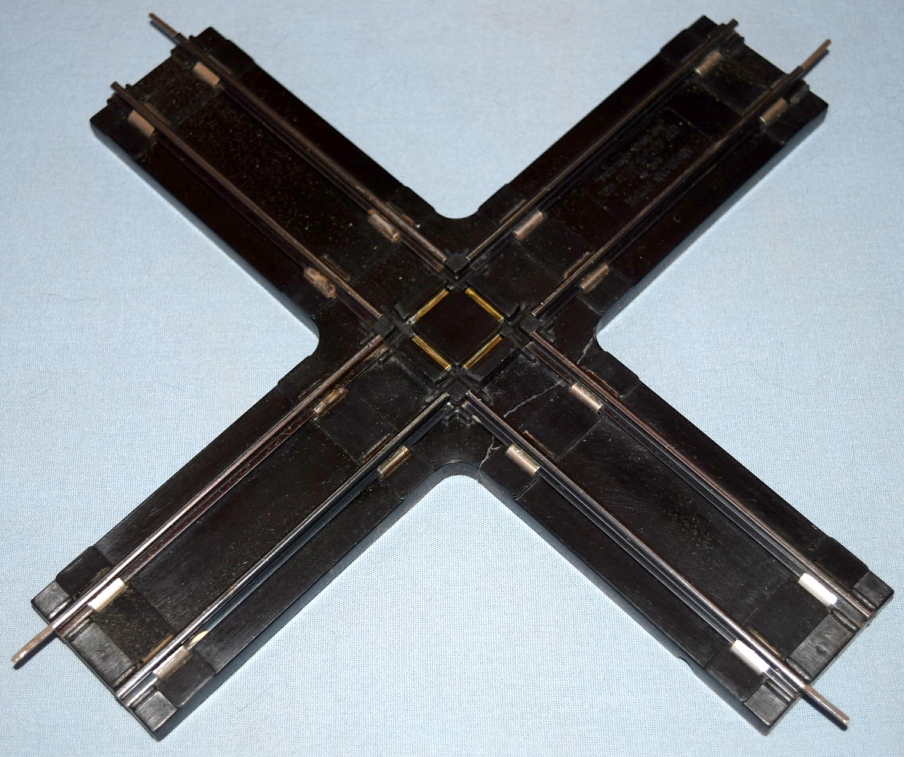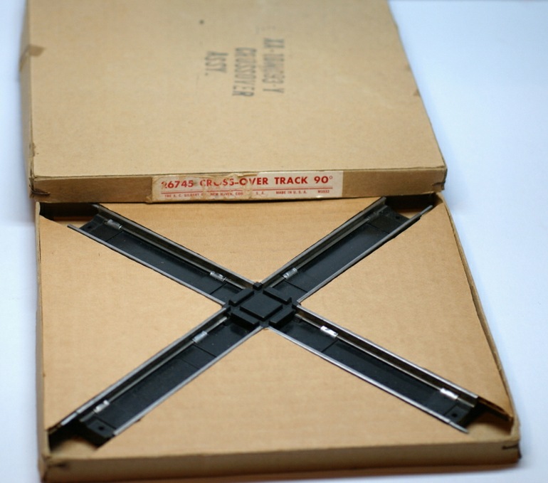 This item was produced from 1946 through 1956, in two variations. The rarest variation, which was produced in 1946, has brass strips in the wheel channels of the crossover plate; a feature that was discontinued in 1947. The brass strips were originally thought to correct loss of tender wheel contact while crossing the diamond. However, it did not work well after the contacts got dirty. The common variation was made from 1947 through 1956. In addition, the 1946 model has blackened rails, which did not appear on a #725 after 1946. Starting in 1957 the part number was changed to 26745, which can only be differentiated from a 725 by the number on the original box. There is one difference in the crossing that the Greenberg and Doyle books have failed to mention, and that is that some of the early units have wires that connect the track sections while other have metal strips.