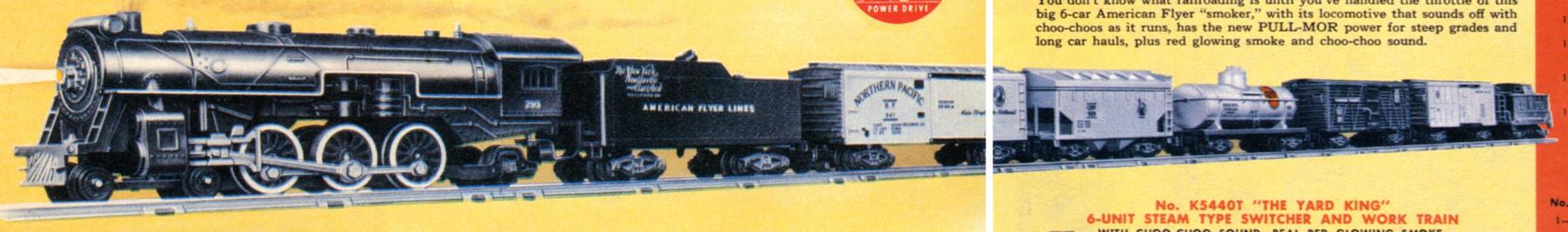 #918R mail pick-up car, #953R illuminated club and baggage car, #952R illuminated Pullman coach car, and #954R illuminated loung and observation car