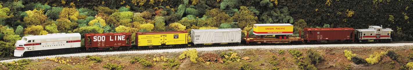 Burlington Refrigerator Express wooden reefer, UP wooden single-sheathed box car, Central Soya two-bay covered hopper, UP Trailer on flat car, ATSF 3-bay hopper, CBQ caboose