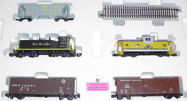 WP stock car, SP PS-2 hopper, Pacific Electric wooden box car, D&RGW TOFC, CB&Q three-bay PS-2 hopper, D&RGW extended-vision caboose