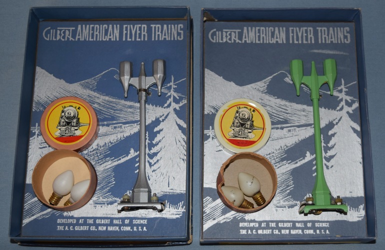 The #580 Double Street Light was produced from 1946 through 1949, packaged as shown in the photo, in two variations. The first variation is light-green while the second is silver. Recently Lionel has reintroduced this street light.