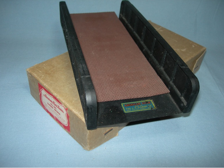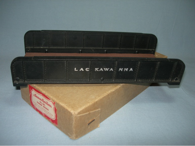 The #581 Girder Bridge was sold by Gilbert in 1946-56 and has five variations. The first sold in 1946-49 in black with "LACKAWANNA" stamped in silver on both sides as shown in the photos of a 1946 model as indicated by the presents of the early 1946 sticker on the bridge. In 1952, 1954, and 1956 the black 581 wording was changed from "LACKAWANNA" to "AMERICAN FLYER" creating the second variation. The third variation produced in 1951 is painted silver with black lettering that reads "LACKAWANNA". Finally the fourth variation is painted black with WHITE lettering that reads "AMERICAN FLYER LINES" and has the number "581" on both ends.