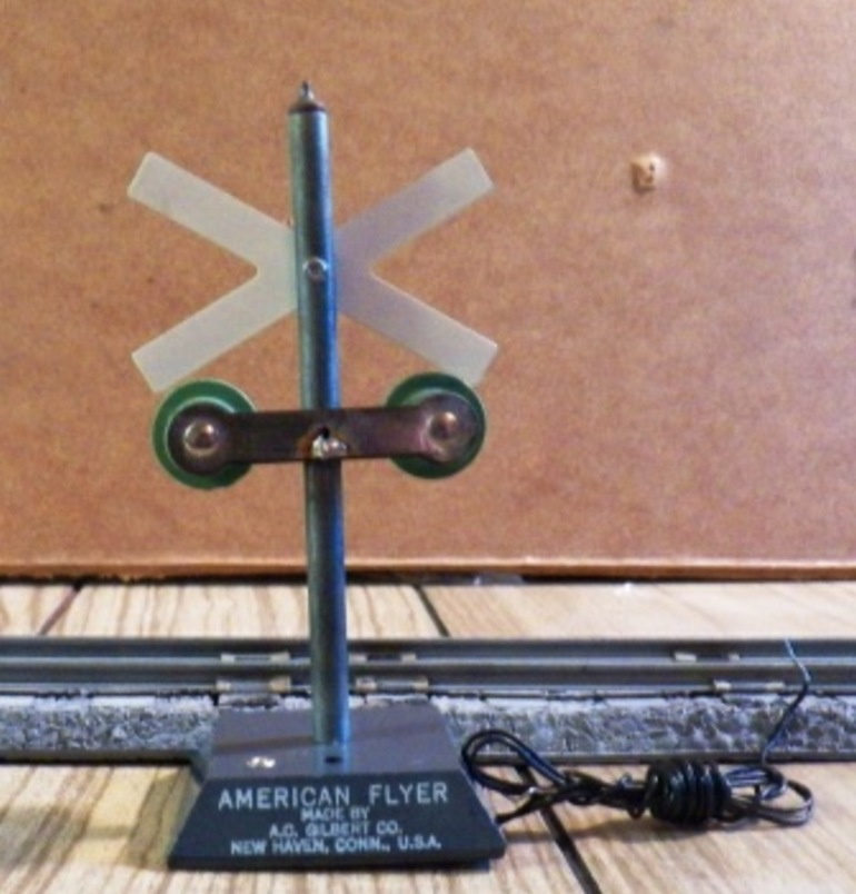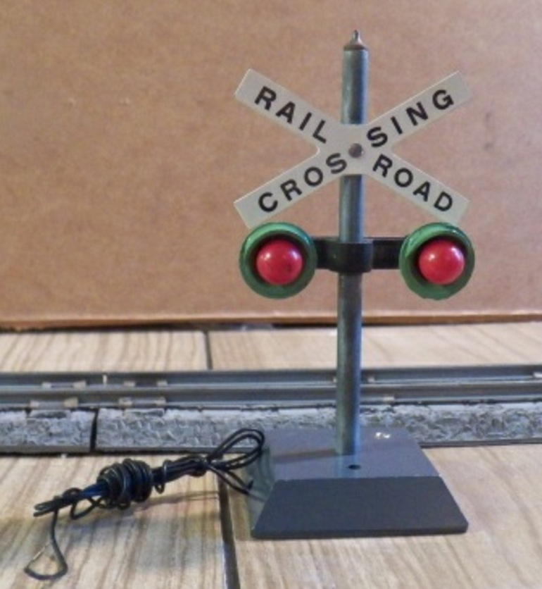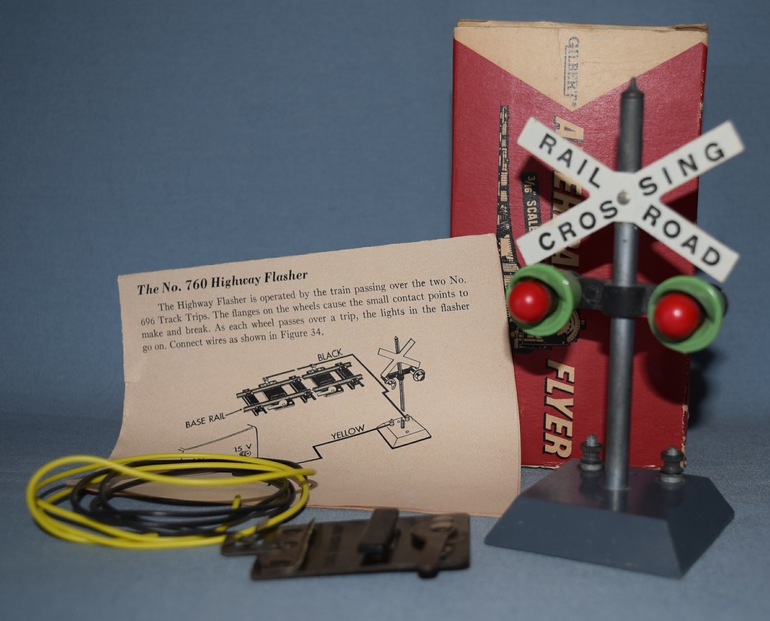 The #760 Flasher was produced from 1949 through 1956 while the #23760 Flasher produced from 1957 through 1960 is essentially identical to #760. The main differences are the boxes they came in, and the type of trips that accompanied the flasher. The #760 came with two #696 Track Trips while the #23760 came with one #696 Track Trip and one #XA16A593 Pike-Master Flasher Trip. The #760 has two variations; the first is identical to the unit in the photo. The second and rarer unit has the wording "RAIL-ROAD/CROS-SING" printed on both side of the cross buck while the #23760 has only one variation.