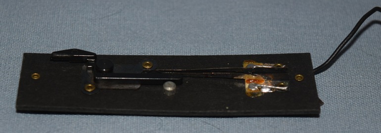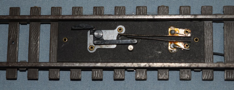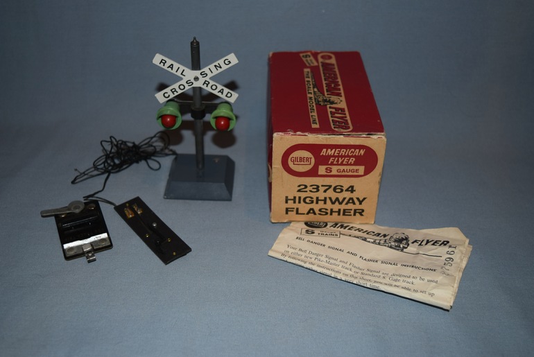 The #23764 Highway Flasher has only one variation, and was produced from 1961 through 1964. The flasher itself is identical to the 1949-56 #760 and the 1957-60 #23760 Highway Flashers that both came with two #696 Track Trips. 1961 saw the introduction of the new Pike-Master line of track. As a result the #696 Track Trips did not work with the new line of track. Gilbert repackaged the #23760 Highway Flasher with one #696 Track Trip for older track and one #XA16A593 Pike Master Track Trip (see Photo #2 for a close-up; Photo #3 shows it positioned on a section of track) for the new track. The Highway Flasher then received the new catalog number of 23764. Note that the Pike-Master Track Trip #XA16A593 was not sold separately and was only available with the #23764 Highway Flasher and the 1961-64 #23763 Bell Danger Signal.