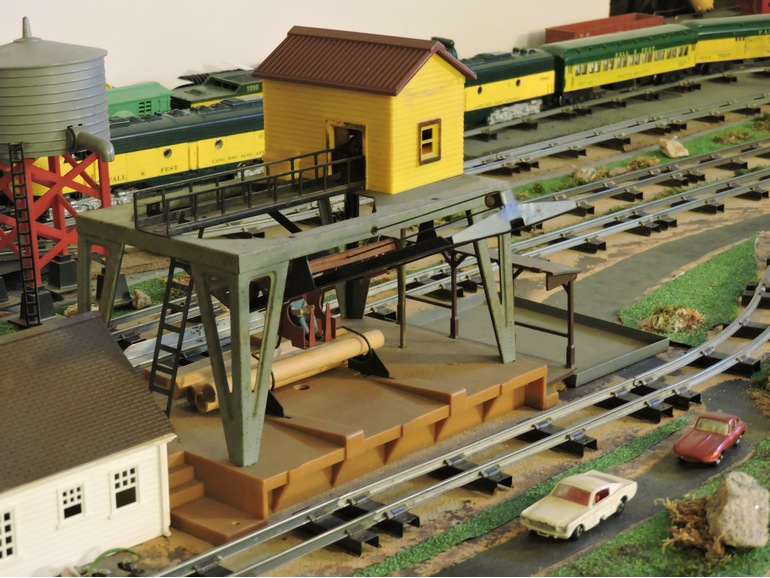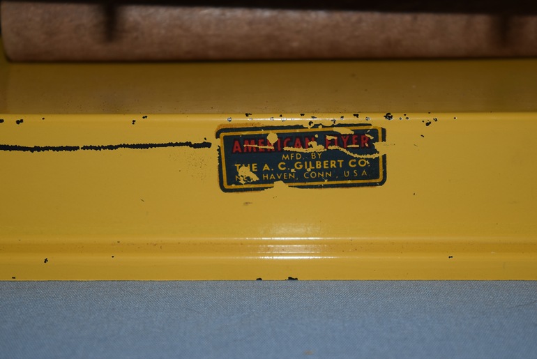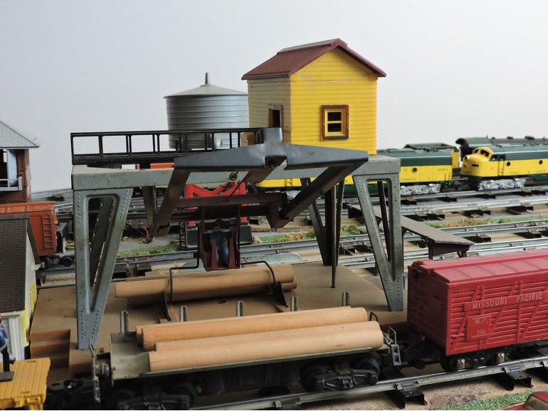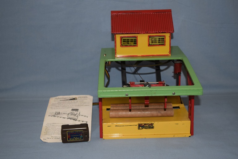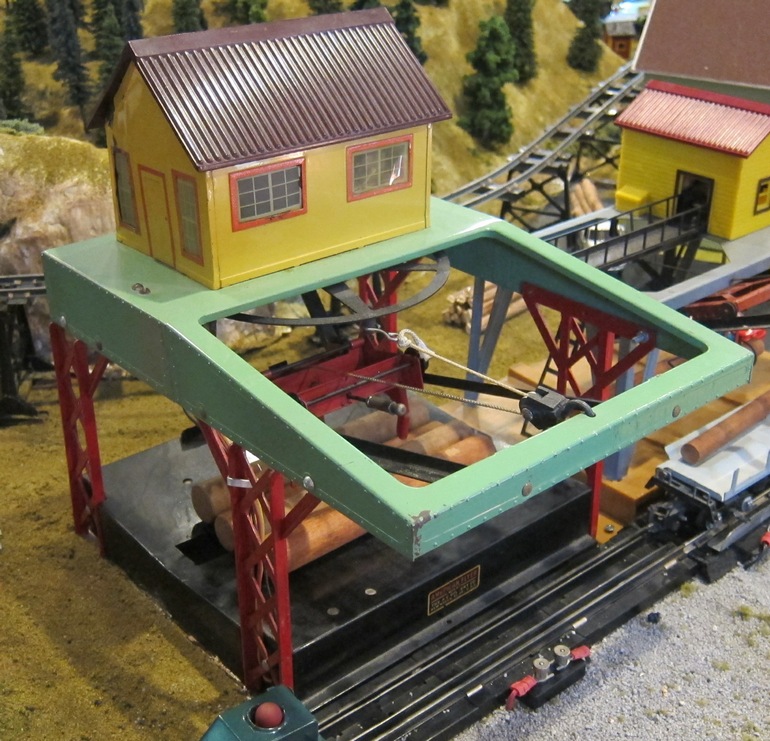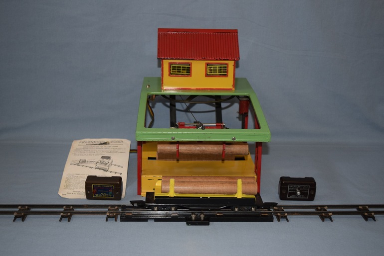 The #751 Log Loader was produced from 1946 through 1950 and has one variation. Early units produced in 1946/47 have a yellow painted Bakelite base and a red painted Bakelite roof while the later units have a black painted Bakelite base and an unpainted Bakelite roof. The model shown in Photos #2 through #4 is from 1946. In the 1952 the 751 was modified and given the new catalog number 751A. One of the major differences is the base was changed from Bakelite to steel with a red Bakelite roof. Photo #4 shows the Log Loader with the 1946 #717 Log Unloading Flatcar and the #710 Special Track Section (these did not come with the #751).