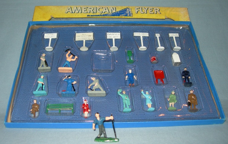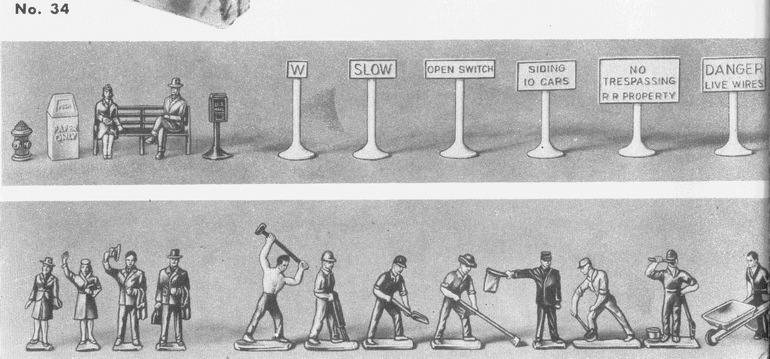 Note that in front of the set box is a figure of a man with a pry bar that was not mention in Greenberg's description in their Volume II book. Greenberg lists only 24 of the 25 figures in the set which was an oversight. Additionally in the 1953 catalog artwork (see second photo) for the set, it does not show the man with the pry bar either. In place of that figure, the 1953 artwork shows a flagman with a red flag.