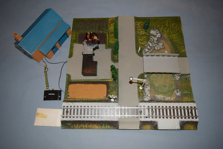 The #26122 Scenic Straight Panel with Remote Control Whistle was offered by Gilbert in 1965 and 1966, in two variations. The first variation, shown in the accompanying photos, is without artificial snow and is considered to be very uncommon. The second variation, produced in 1966, was covered with snow is very rare. The #26122 panel has a built-in whistle. This is the same whistle unit Gilbert used in the #568 and #23568 Whistling Billboards. The whistle unit was concealed by the house. The panel itself was manufactured in Portugal and assembled in the United States. It has been reported that the house and possibly other components such as bridges, fences, etc. on this unit as well as the other All Aboard Scenic Panels were manufactured by Bachmann. The #26122 was never part of the four major sets that include either six, eight, or 12 panels and a train set. In 1966 Gilbert elected to cover some of the six-panel sets with artificial snow creating the fourth set and calling the set "Winter Wonderland". The #26122 was featured in the 1965 and 1966 catalogs with five other "Add-On Scenic Panels" that came either without snow in 1965-66 or with snow in 1966 that would allow the owner of any of the above-mentioned sets to expand their pike for added play value.