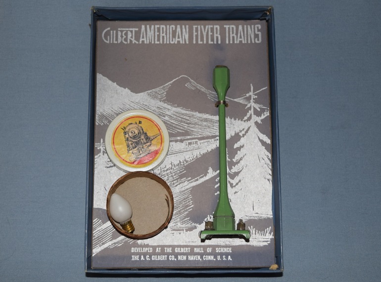 The #579 Single Street Light was produced from 1946 through 1949 and packaged as shown in the photo, in three variations. The first, and most common variation shown in the photo, is light-green. The second variation is dark-green, while the third variation is silver, which is rare. Recently Lionel has reintroduced this street light.