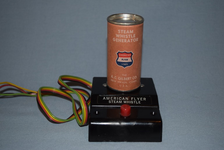 The #26739 was produced in 1957 and 1958 in only one variation. The #26739, as described in both the Greenberg and the Doyle books, appears to be identical to the #710 1955-57 Steam Whistle Control, as shown on this web site. The #26739 shown in the photo does not match any of descriptions listed by these references. In 1958 the #26739 shown in the photo was sold with the uncataloged #293, the #21099 locomotive that was part of the #20345 Meteor set as well as the #21129 which was part of the #20470 NYC Pacemaker set. Photos of these two sets as well as that of the #293 all indicate that the #26739 actually was packaged as shown in 1958 to include the distinctive and unusual salmon-colored electronics tube. In 1957, Gilbert converted their numbering system to the new 5-digit system. For many accessories the boxes carried the new 5-digit number however the accessory inside was still the same as the old 3-digit number. In conclusion, Ted believes that #26739 was redesigned during 1957 and the new design as shown in the photo was produced and offered in 1958 only.