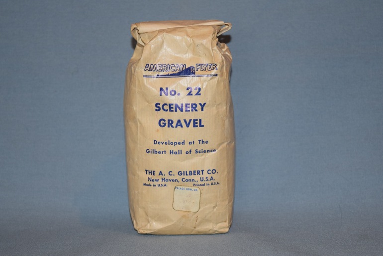 #22 was produced from 1949 through 1956 in two variations. Both variations came in a white paper bag which contained 22 ounces of the scenery gravel. Over time, the bag would turn yellow/tan with age. The difference in the two variation is that one variation has blue lettering on the bag, as shown in the photo, while the second has black lettering.