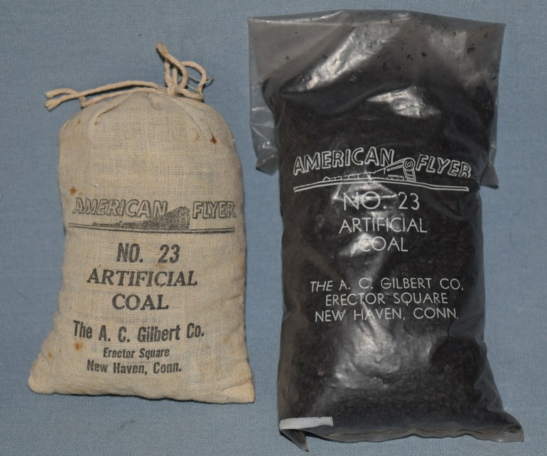 #23 Artificial Coal was produced from 1949 through 1956 in two variations. Both variations contained approximately one-half pound of coal (which were actually chips of Bakelite). The first variation shown on the left in the photo was manufactured by Paxton for Gilbert in 1949 and 1950. It came in a white cloth bag. On the right in the photo, the second variation came in a 3-1/2" x 9" plastic bag that was manufactured by Colber Corporation for Gilbert from late 1950 through 1956.