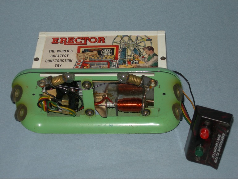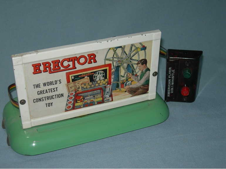 Produced in 1949 and 1950, the 2-in-1 Billboard Whistle has only one variation. The purpose of this whistle is to give two distant sounds for the model railroader. By pressing one of the two buttons it generates the sound of a distant train. Pressing the second button it gave the sound of a nearby train. This magic was achieved by using a solenoid that diverts the air from the motor through a different chamber in the whistle assembly. In the second photo, which shows the underside of #762, you can see the solenoid and the whistle assembly.