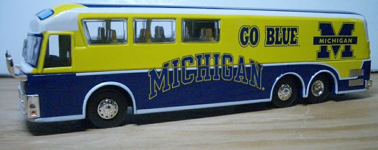 Decorated for the University of Michigan Wolverines. Fleer Collectibles bought out White Rose Collectible who produced this bus. Fleer specializes in making sports-related trading cards and diecast models in various scales, including S.