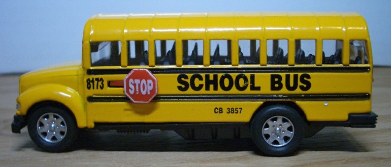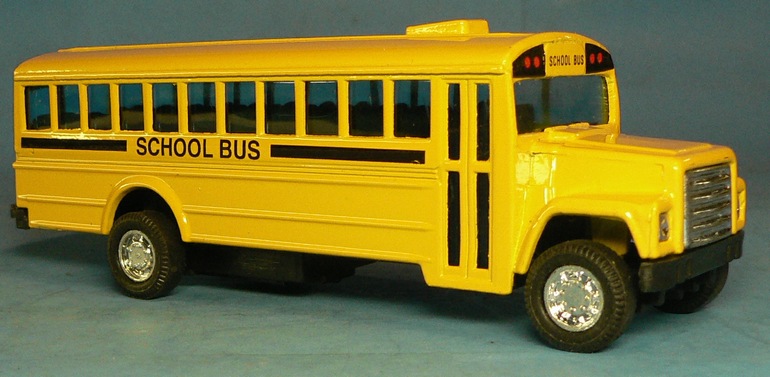 This school bus is a load on the Menards O-scale flat car. The bus, however, is a perfect match for an S-scale model.