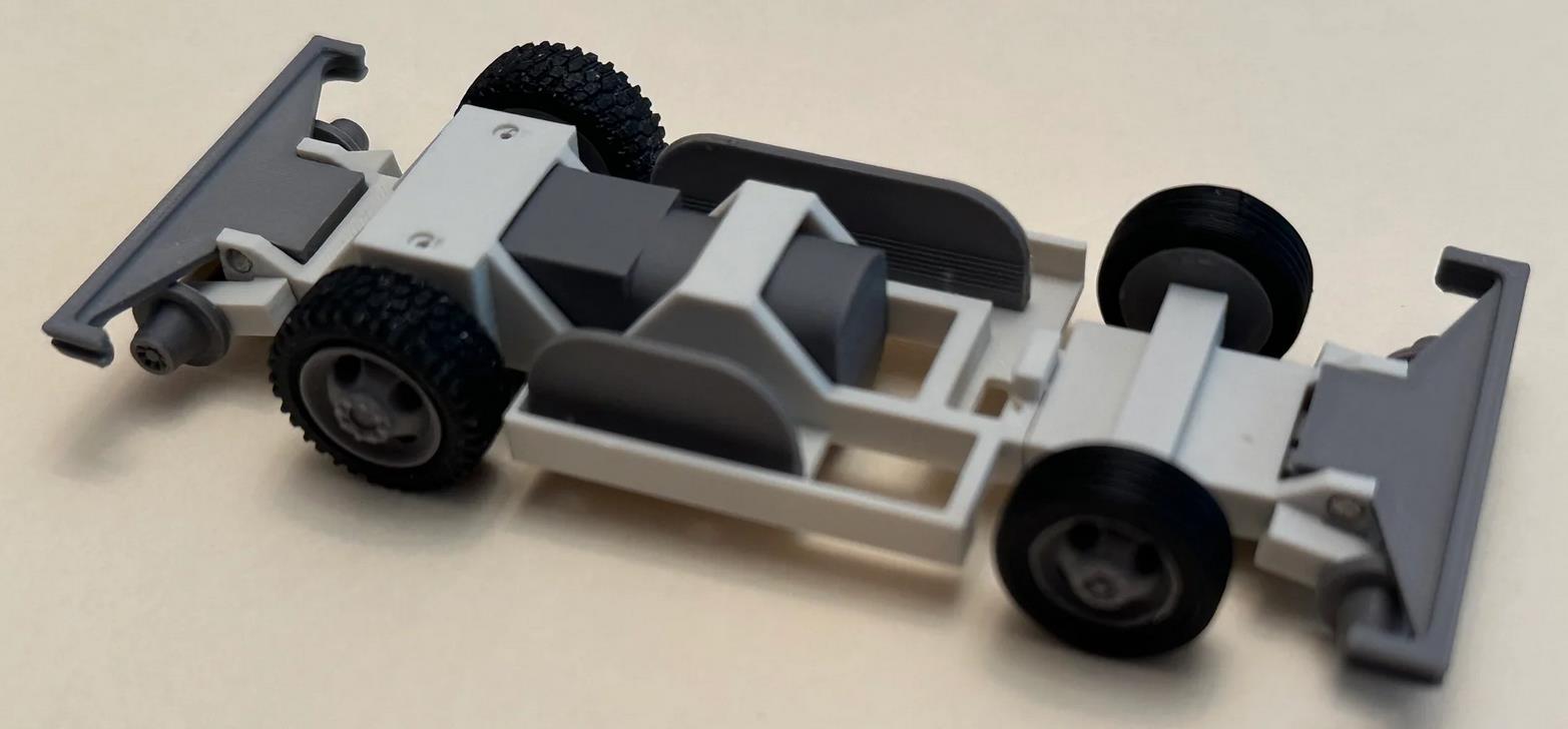 The company has two versions of this bare chassis available. One version has just the road-going wheels, and the other version has both those and the rail-going wheels (for road-and-track maintenance-of-way vehicles). Furthermore, you have the option of ordering the fully motorized version (see the first photo) which includes all of the necessary electronics or the non-motorized version (the second photo) for static models or for with use of the company's InvisaTrax system. The motorized version comes with a 3.7 volts lithium-ion rechargeable battery and a 15rpm motor, which allows for both forward and reverse movements. DCC incorporation is possible by the modeler, and the wheelbase is somewhat flexible.