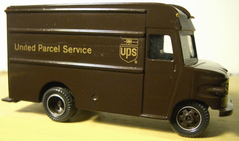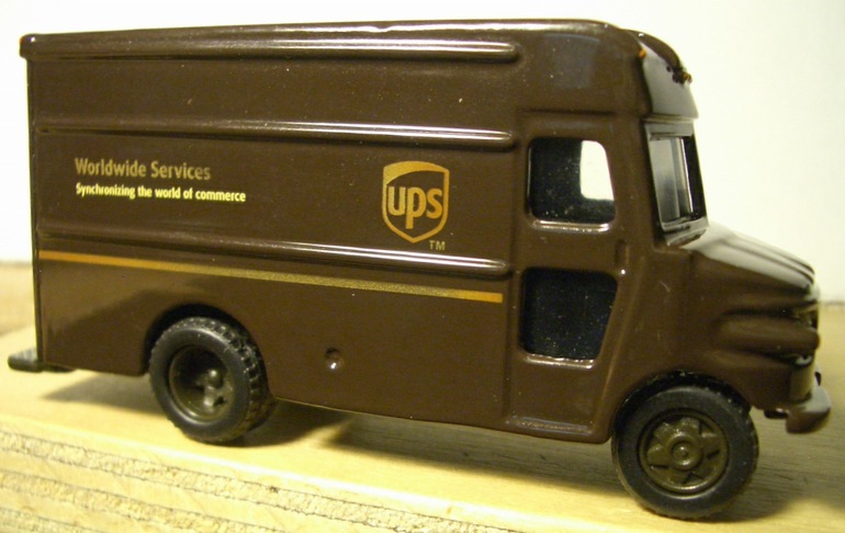 "UPS". This is a very accurate model. Made in China. Photo #2 shows a more modern logo, and the door has a second window.