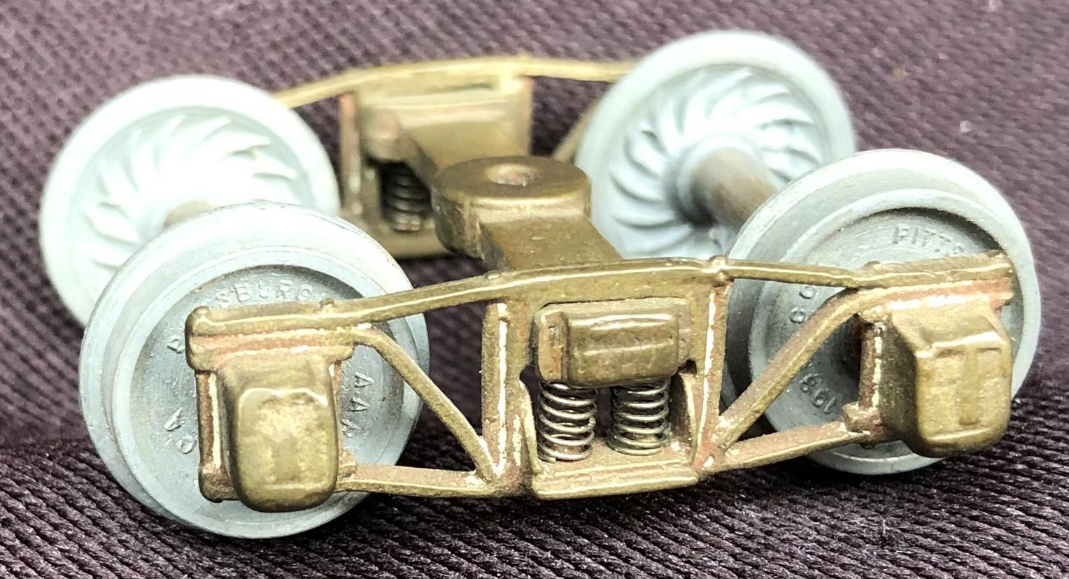The model in the photo is owned by David Felmley. The truck was manufactured by Howard Phillips (the "P" in S&P Distributors who owned the Rex Engineering product line at the time). Sprung and equalized, these cast-brass trucks would accept any blunt-end 1/16" axle; shown here with Culp Brothers' diecast 33" wheels representing ribbed-back cast-iron prototypes.