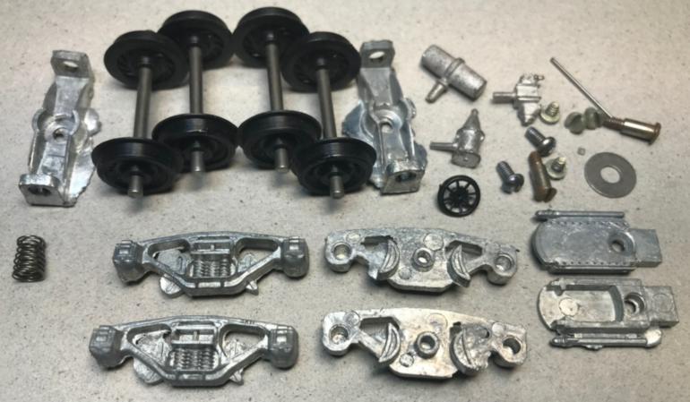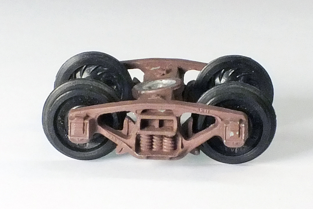 Scale wheels. Equalized, not sprung. Bud Rindfleisch commented that the Rex trucks were poor rollers and had plastic wheels. He has improved them by drilling out the journal holes to accept an Ace Delrin bushing, and then putting in NWSL blunt axle wheelsets. This makes them roll nearly as nice as the S-Helper Service or American Models trucks. For the ones with the old Ace steel wheels, he had to file down the lip on the bushings to get clearance for the wider wheelsets.