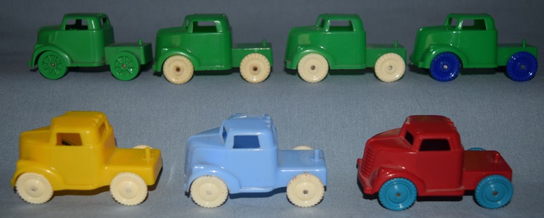 The circus trucks are primarily green in varying degrees of opaqueness. Other circus trucks were also produced in red, light blue, and yellow. Initially, the wheels on the trucks were cast green without "pot-holes" like those on the cages.