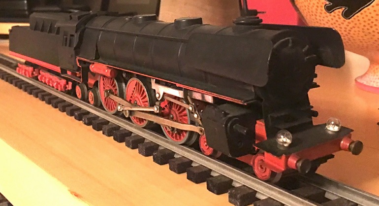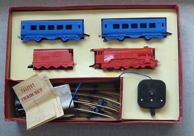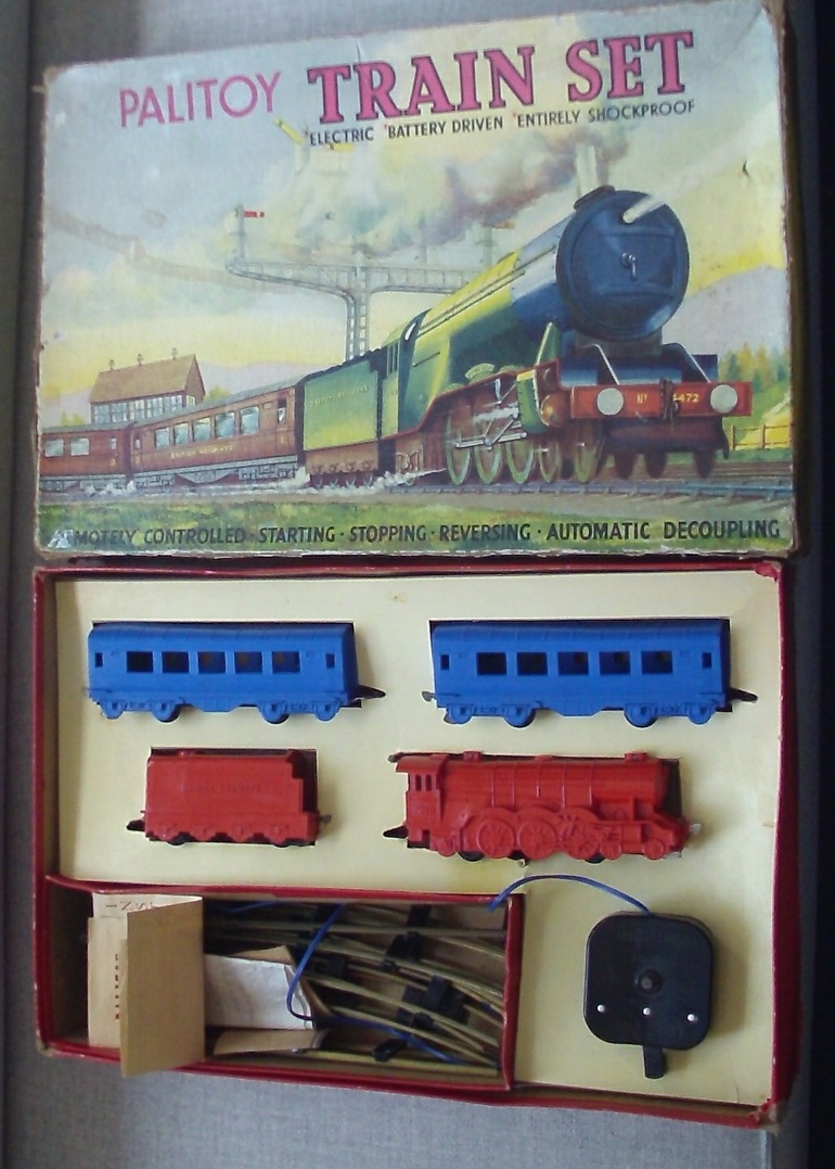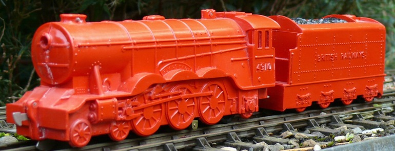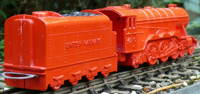 This British company produced plastic train sets in S-scale from 1950 through 1960. These sets have plastic locomotives and cars, and came with S-scale track. The brass rails of the track were fed via a controller that provided battery power to the rail. The electrical pick-up of the locomotive can be seen between the second and third driving wheels in the photos below. The wheels were all part of the body, and the locomotive and tender had four hidden wheels used for running. In the set shown below, the locomotive measures 30cm (~11-3/4"). The designer made a very special interpretation of the valve gear of a Flying Scotsman.