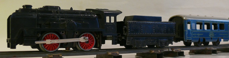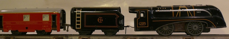 JEP, short for Jouets de Paris, which translates to "Toys from Paris", was a French toy-train company that produced primarily HO- and O-scale products. During the 1950s they produced some S-scale products. They ran on S-scale track of the time. A bit more company history is available on this web site. Fred van der Lubbe, together with author Claudia Nagel, have made available a free eBook (PDF) that captures information about the company and their S-scale products. The 80-page is available in English and in German. It contains lots of photos. JEP produced mechanical clockwork locomotives and electric ones. A video of one of their clockwork train set is available on YouTube (also see photo below).