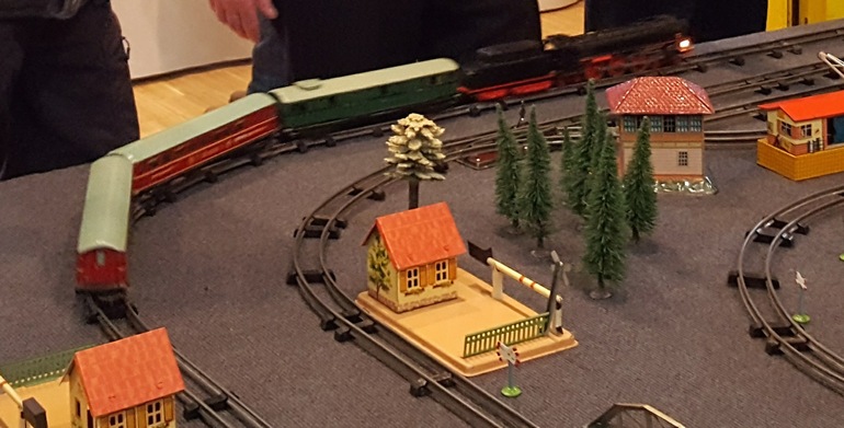 Bub was a West German company started by Karl Bub. They produced model railroading products for various scales, including S. A bit more company history is available on this web site (which also shows a few S-scale product photos). Apparently when Bub examined American Flyer track, they made a calculation error converting the track spacing from inches to millimeters, and so their wheels are gauged to 24mm. So, the equipment won't run directly on A.F. track, unless the modeler adjusts the gauge. In the second photo, taken at a German train show in 2016, the outer loop shows a Bub passenger train running on S-scale track. It is a German-prototype 4-6-4 with passenger coach cars. Fred also has a video showing a Bub train set in action, and another Bub train set in action.