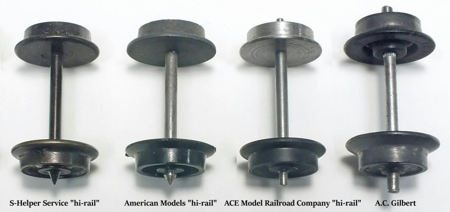 Below is a nice comparison photo of hi-rail wheels. The wheelsets marked as manufactured by S-Helper Service are going to be identical to those produced by MTH, and are likely to be identical to the ones that ScaleTrains is now producing, as they are all based on the same designs that S-Helper Service originated.