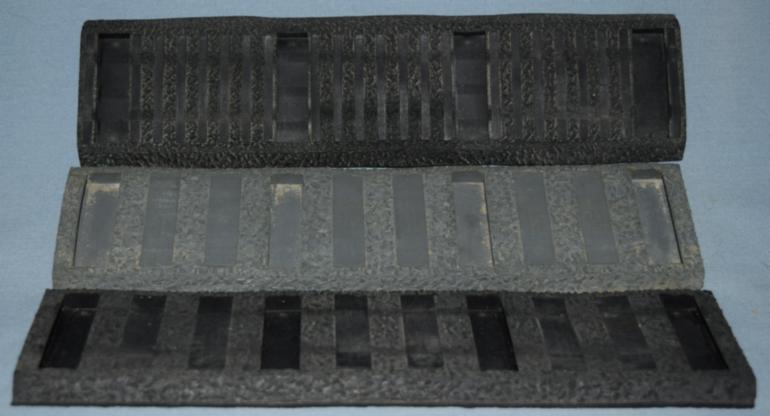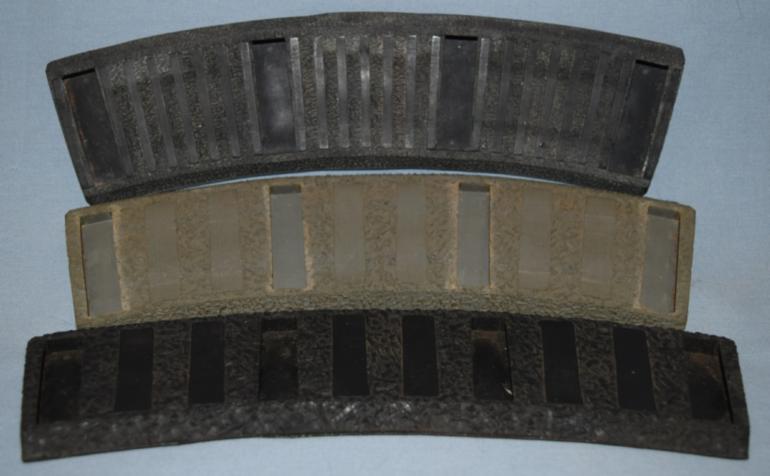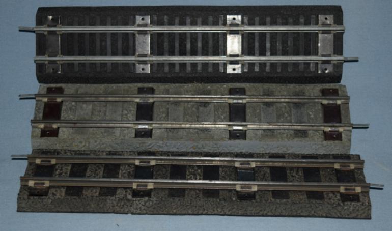 Part #726 was the rubber underpinnings for track sections that offered more quiet operation, and a simulated ballast roadbed for the original track. It also simulated the additional track ties. These were made in three variations, which are shown together in the next photo.