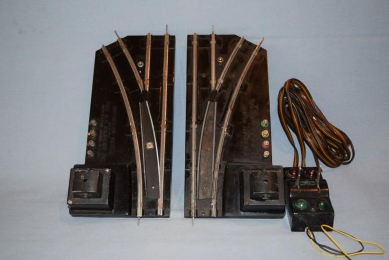 Left and right turnouts (switches) were also provided. This pair, #720A, offered remote control (manual-throw ones were also available). They use the "closed-frog" method. What this means is that the center part of the turnout, where the two diverging routes meet, the black part swivels left or right matching the direction that the turnout's points are set to. This provides a continuous track for the wheels to follow. This is not how it is done in the real world, but it did provide for bullet-proof tracking of engines and cars through the turnouts.
