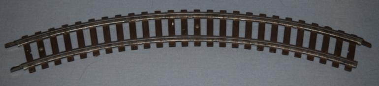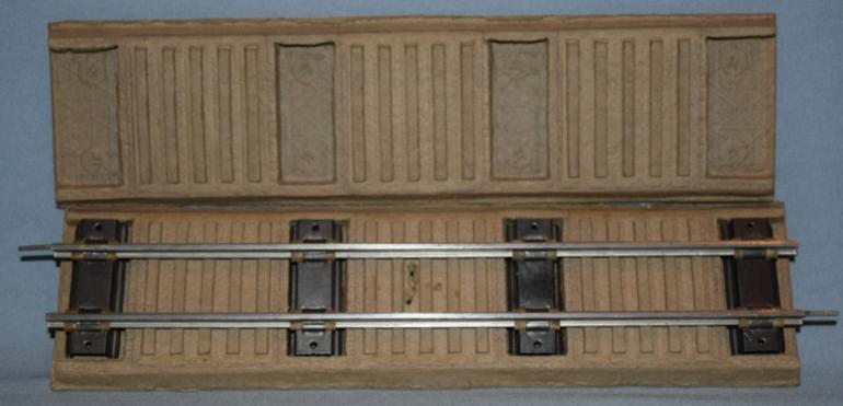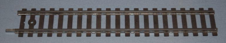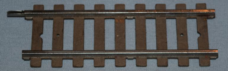 Starting in 1961, A.C. Gilbert introduced their Pike-Master track components, which increased the realism of track to a whole new level. The look of it is not too dissimilar from today's sectional track systems, regardless of scale. The example shown in the photo is part #26300, which is a ten-inch straight section. It has a mounting hole in one of the ties, to allow the customer to apply a screw or nail through it, to fasten the track to a substrate.