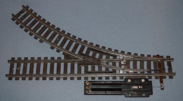 Turnouts were also produced. This one is part #26320, a right-hand turnout (a matching left-hand one was part #26321). These could be hand-thrown or remote controlled. Note that these did not have the closed-frog solution, but much more simulated the real world frogs. A side note: If you look at the guard rails (the short sections of rails near the frog point) you will see that they are a good ways away from their adjacent rails. It is this wider gap, which is required for the larger A.C. Gilbert wheelsets, that causes "scale" equipment to not operate correctly on these turnouts; there is too much "play" for the thinner scale wheels, and so it is easy for them to pick the frog and derail.