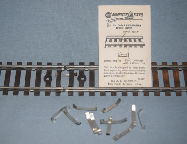To hold the different sections of track together, A.C. Gilbert produced part #26343, which is a package of track locks that snap in under the ties.