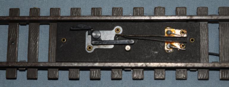 To trigger animations, these track trips could be installed. This is part #XA16A593, shown here installed in a piece of Pike-Master straight track.