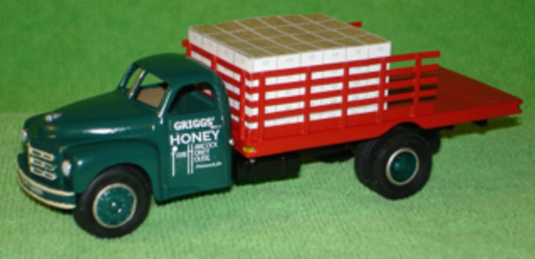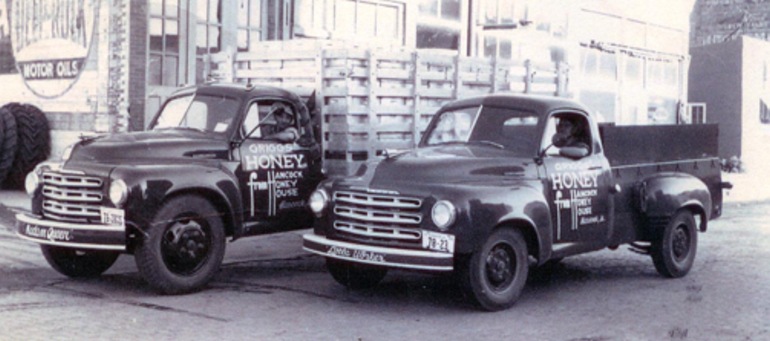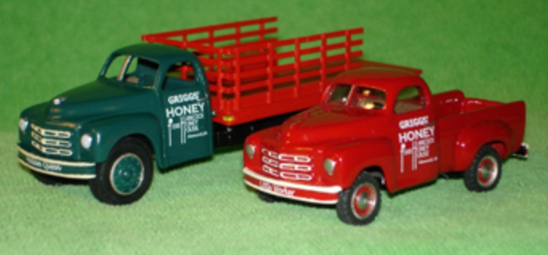 Randy's father was involved in the bee-keeping industry. He owned two Studebaker trucks (a 1950 and a 1949 model) that Randy always wanted to model in S-scale. The photo below shows his Dad on the left in "Madam Queen" (the name of the truck) and a hired-hand on the right in "Little Worker". Note the names on the bumper of each truck.