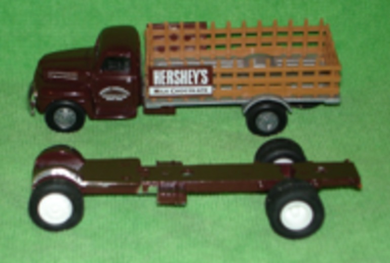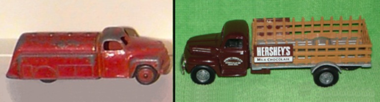 The "Madam Queen" 1950 Studebaker model required more work. Randy started it with two donor models, the Dinky toys' Studebaker tanker truck's cab (left) and the Hartoy stakebed truck's frame (he didn't use the stake bed itself because it didn't match the prototype).