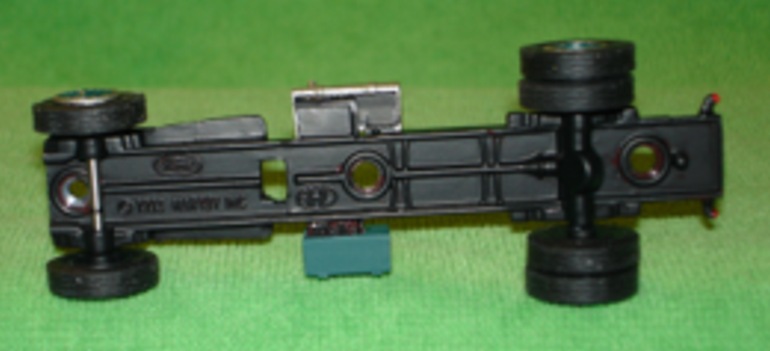 The Hartoy frame was modified by adding larger wheels, shortening the tank, and the sides of the front fender liners had to be shortened to get the Dinky cab to fit.