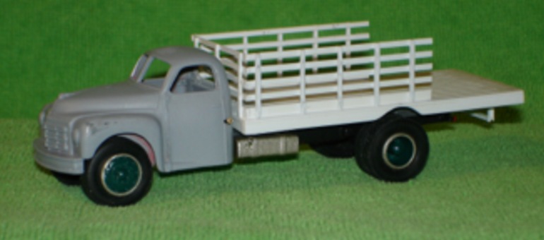 The photo below shows Randy's final models in S-scale. The 1949 "Little Worker" (on the right) was built using a Shrock Brothers 1949 Studebaker pickup model. The model is labeled as "1:55" scale, but Randy found that it is closer to 1:64.