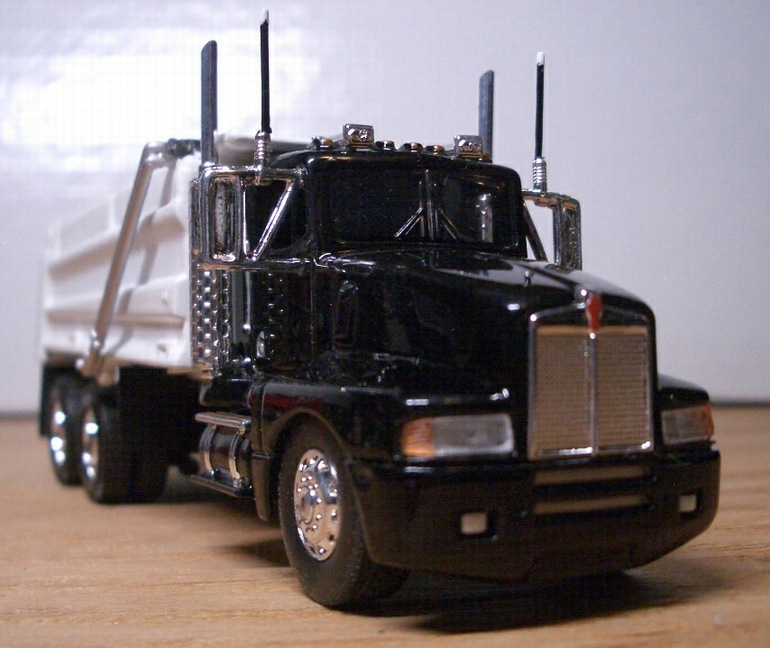 The cab is a modified GearBox Collectibles' Kenworth truck, from which he removed the sleeper compartment, the air foil, and the decals. He added the CB antennae. The hardest part of the project, according to Carl, was matching the cab's paint, which in this case turned out to be pure black (not any other shade).