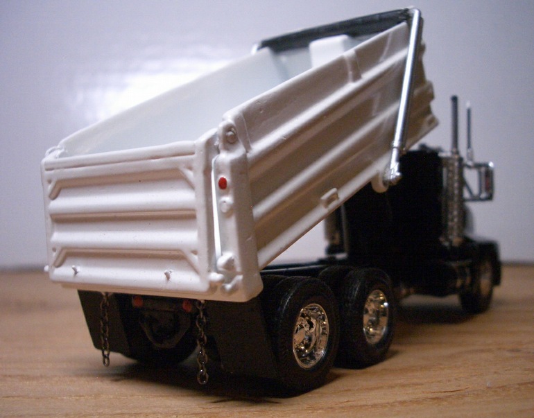 The dump body was from a Tonkin Replicas model. The cover mechanism is from a First Gear model. Carl then added the chains and pins to prevent the gate from opening too far when the content were unloaded. This model is designed to carry gravel.
