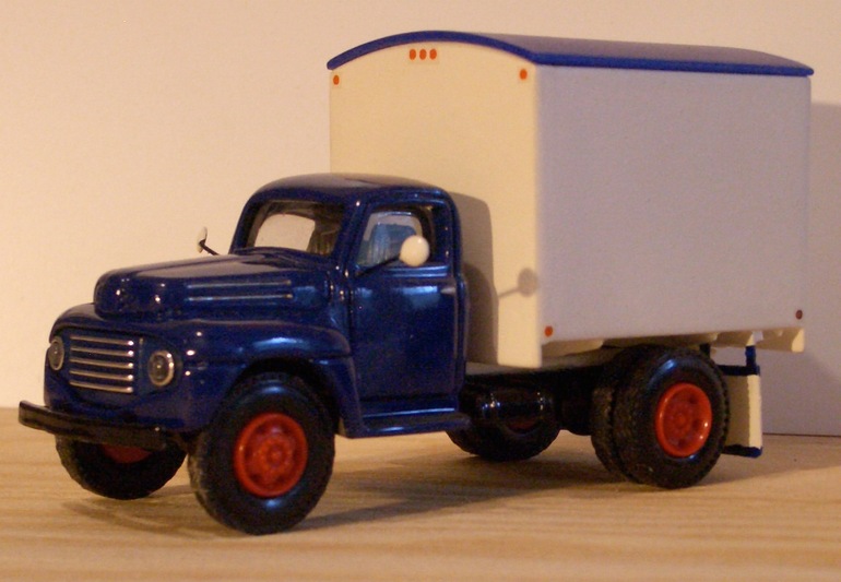 Carl modified this Hartoy 1948 Ford F-5 box van truck by adding mirrors, mudflaps, marker lights, and he shortened the box.