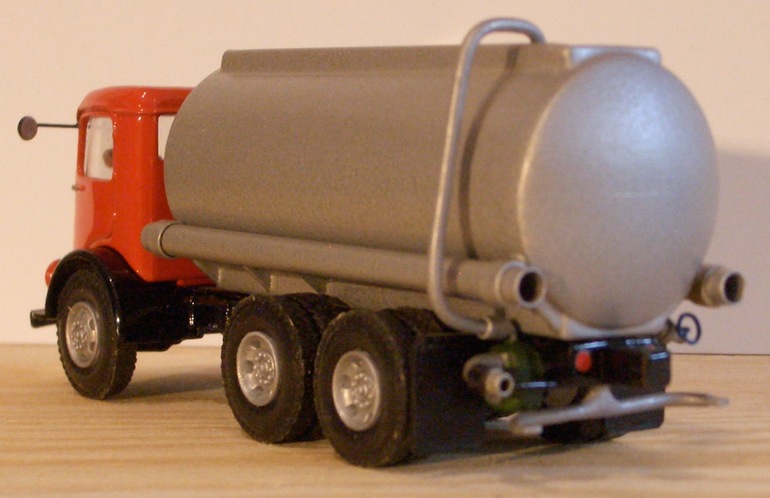Using many parts from his parts bin, Carl constructed this model of a water truck. The mirror and hose holders were made out of brass. Parts that are hard to see are the mudflaps and the pump to fill the tank. The large vertical "arm" around the body allow the truck to be pushed by heavy equipment. The water sprayers are visible near the bottom rear of the model.