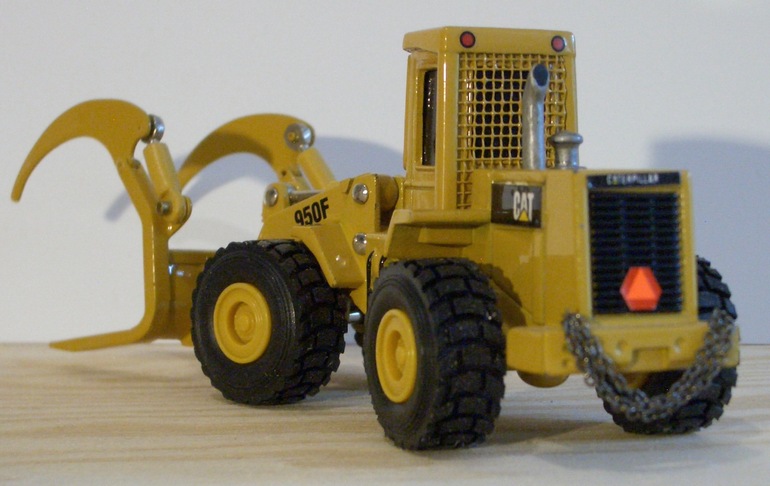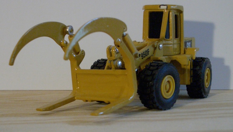 This was a Norscot Scale Models Caterpillar 950F Wheel Loader model where Carl removed the bucket and made into a log loader grapple. The wheels are from an Ertl machine. Note the single headlight at the top of the cab.