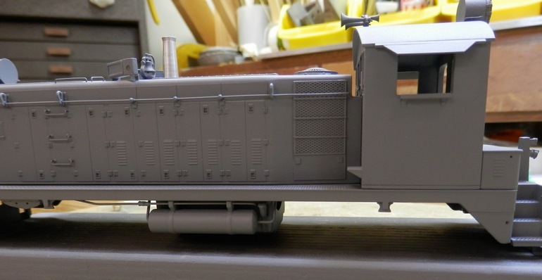 The model is a kit-bashed S-Helper Service undecorated SW8. I began by removing the existing lights on the front hood and the cab. I also removed the slope at the cab end of the hood, making space for the dynamic brake area in front of the cab. After filing and sanding the areas where parts were removed, I started building up the dynamic brake section of the hood using styrene. It was a matter of using the best modeling techniques by cutting, fitting, filing, filling gaps, and sanding until you get result you want. Be aware that the top of the hood is at the same level from the front to almost a foot in front of the cab and then drops (see photo below).
