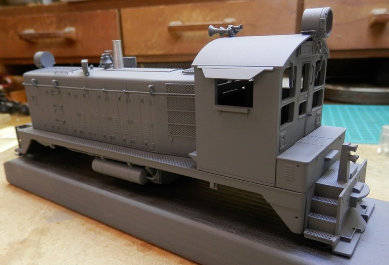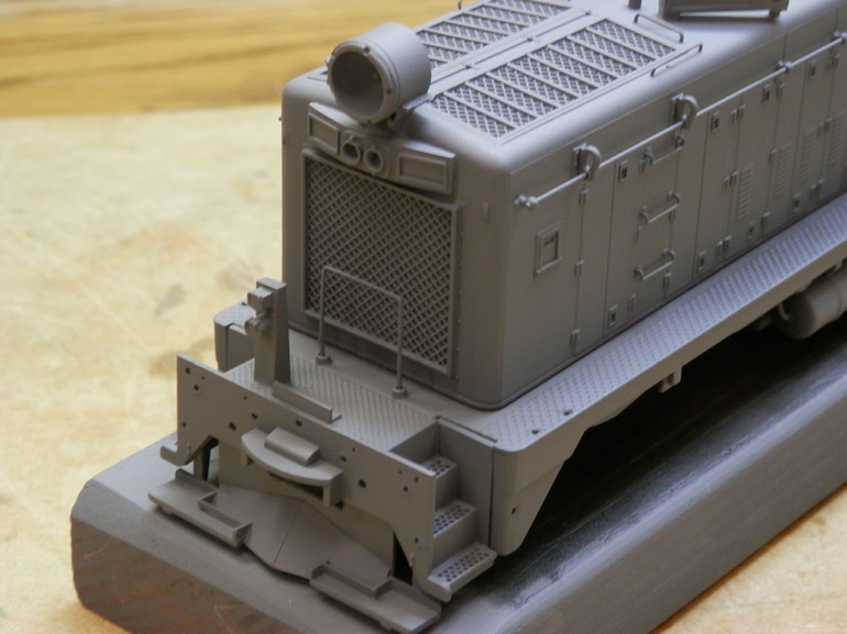 After drilling holes and adding grab irons on the right side of the hood, I added cab awnings. The horn is a B.T.S. three-chime one, part #02002. The stack I turned from aluminum stock. I removed the pilot steps and backing plates from the existing pilots and fabricated new ones, and installed them on beams. Other details added to the frame are B.T.S. M.U. stand #02050 and B.T.S. re-rail frogs #02037.