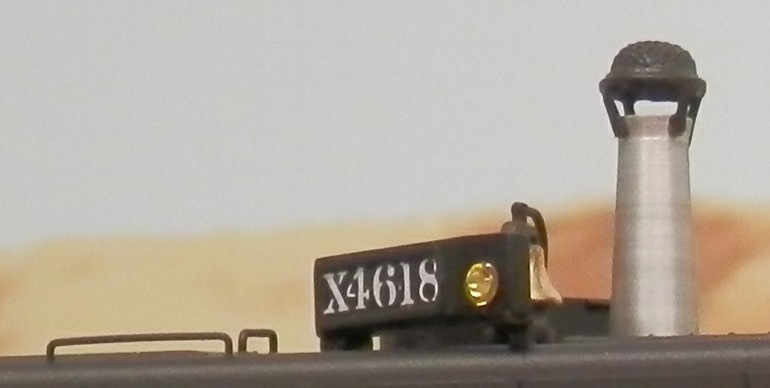 The train indicator boards were made basically the same as the light, cutting styrene to size, then shaping a wedge at their ends using a small chisel knife. A small drill was used in the lower corner of the indicator board's shaped wedge for an MV Products lens. Then I installed the boards on the hood. Because of the train indicator boards on each side of the hood, grab irons are needed on both sides (see close-up photo below).