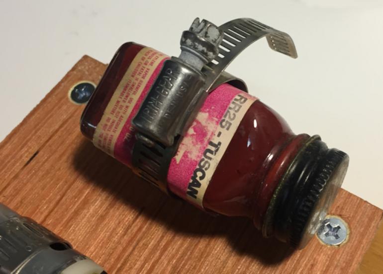 Install the paint bottle and tightened the hose clamp. Make absolutely sure that the cap is on the bottle very tight! Woody was even able to use the old Floquil square bottles. Be sure to check all attachments before turning the unit on each time, just in case something wiggled loose.