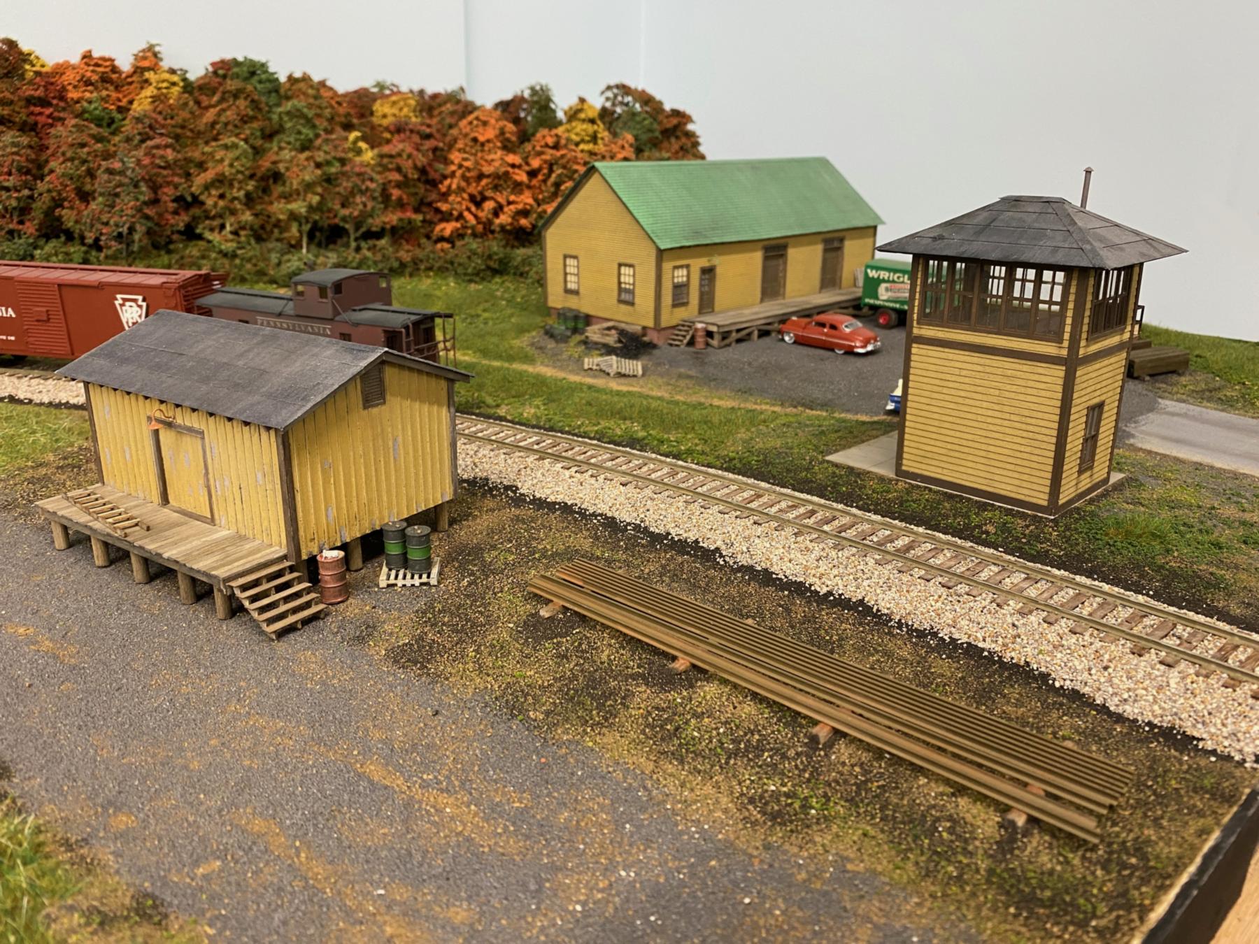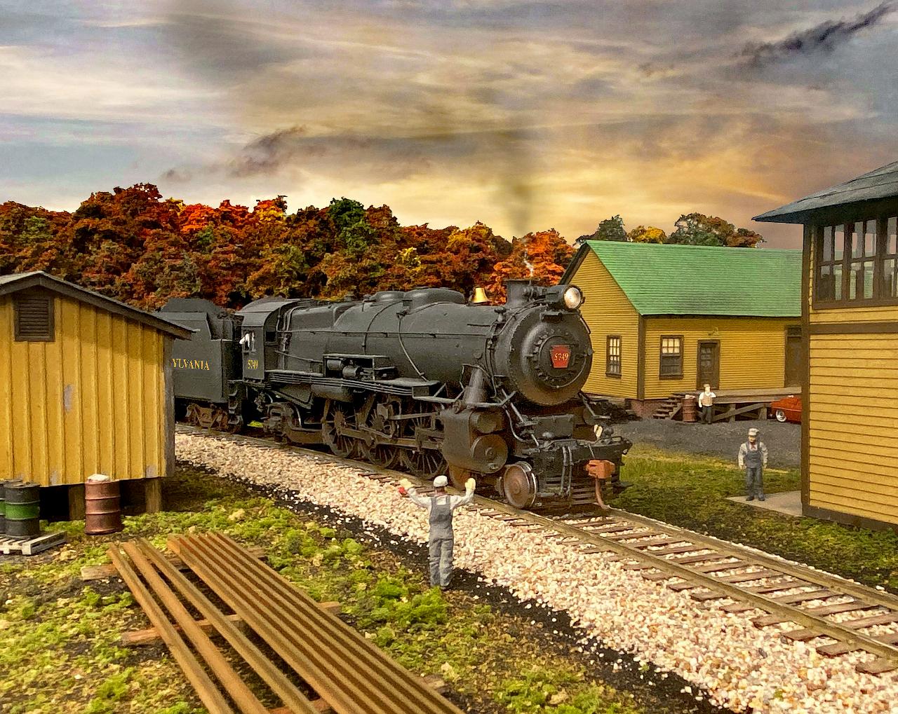A PRR K4 leads one of the last afternoon passenger trains on the Elmira Branch from Canandaigua, NY to Elmira, NY. The train passes through the Stanley, NY PRR maintenance yard on its way east. The brass K4 was imported by Omnicon Scale Models, built for them by Samhongsa out of Korea. Alan installed the Jackson Standard gearbox to fix a common issue with these engines. He also installed the SoundTraxx Tsunami2 DCC sound decoder. The track is code 100 Shinohara laid on Homabed, and turnouts are hand-built from Fast Tracks jigs. The tower and shed in the foreground were built from laser-cut kits. The maintenance building towards the rear is scratch-built. The smoke effects and sky were applied to the photo by Brooks Stover. This photo appeared on the inside cover of the December 2022 and October 2025 issues of Railroad Model Craftsman in the NASG promotional ad campaign.