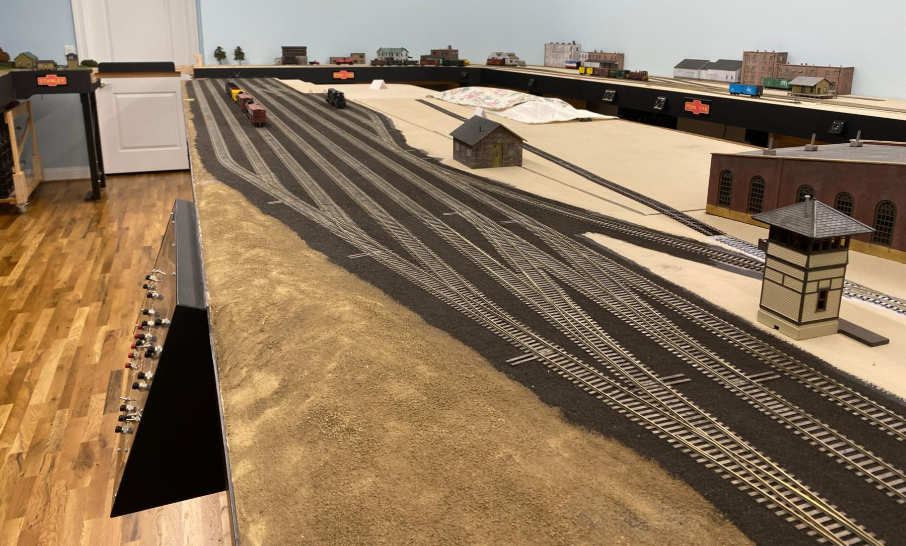 Beautiful trackwork with a dedicated control panel to manage the turnouts in the yard on the center peninsula. This photo was taken in 2022.