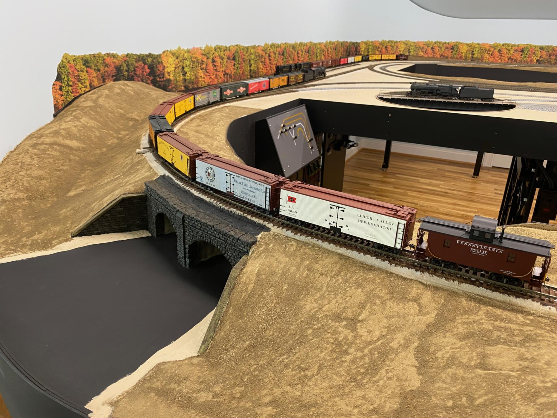 Alan's beautiful benchwork is on display in this photo. While the layout is operated on a point-to-point basis, the construction is an around-the-room design with a central peninsula. His layout allows for continuous running which is helpful for when visitors come to see the layout. Be sure to watch the video, linked to above, to get an even better overall view of the layout.